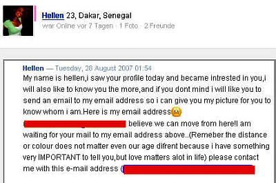 My name is hellen,i saw your profile today and became intrested in you,i will also like to know you the more,and if you dont mind i will like you to send an email to my email address so i can give you my picture for you to know whom i am.Here is my email address:-(gestrichen) believe we can move from here!I am waiting for your mail to my email address above..(Remeber the distance or colour does not matter even our age difrent because i have something very IMPORTANT to tell you,but love matters alot in life) please contact me with this e-mail address (gestrichen).