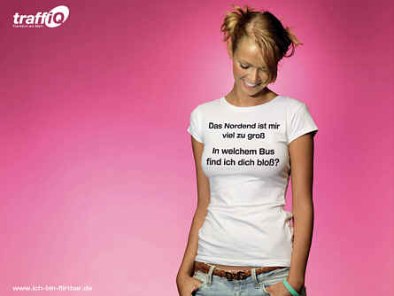 „Ich fahre täglich nur noch Bus, weil ich dich wiedersehen muss“ – Allerweltspoesie, auf T-Shirts verewigt, sollen für den Nahverkehr in Frankfurt werben – und mit den „hervorragenden Flirtmöglichkeiten“, die dort angeblich bestehen sollen – und natürlich nicht nur in Bahnen, sondern auch in Bussen.
