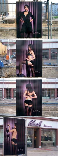 Der Berliner Dessousspezialist „blush dessous“ hat sich wegen einer Baustelle eine besondere Art der Werbung einfallen lassen: Am Bauzaun wird die Entfernung bis zum Laden auf Plakaten angezeigt – und auf jedem Plakat trägt die Dame etwas weniger Kleidung.
