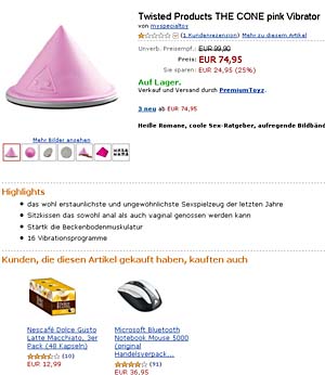 Sexspielzeug, das süße Leben und Mäuse: Was hat es miteinander zu tun? Wir wissen es nicht – Amazon.de weiß es. Jedenfalls kauften Kundinnen, die „The Cone“, einen konusförmigen Anal- und Vaginalvibrator erwarben, auch „Dolce Gusto Latte Macchiato“ und eine Notebook Mouse. Bei anderen Sexartikeln fanden wir keine derartigen Bezüge. Den Hinweis auf dieses und andere Produkte fanden wir übrigens hier (keine Angst, ein seriöses Magazin von germanblogs).