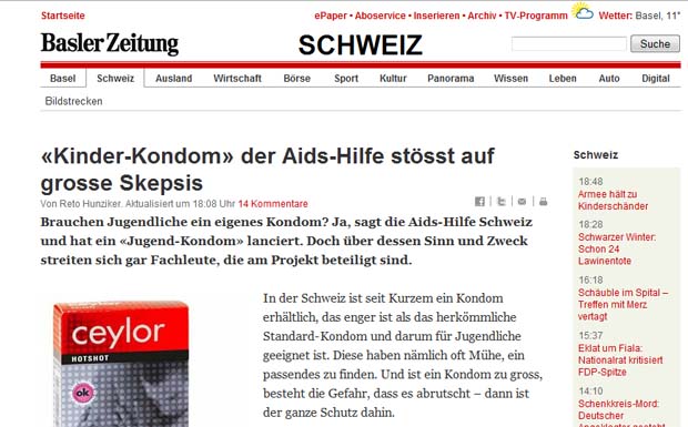 Die Basler Zeitung ist auch nicht mehr das, was sie mal war. Heute um 14.36 zeigte mein Radar im Internet an, dass die Basler Zeitung wie auch der Tagesanzeiger über ein „Kinder-Kondom“ schreiben, doch gegen 17.14 wurde der Titel im Online-Bereich geändert: Jetzt heißt es also „«Jugend-Kondom» der Aids-Hilfe stösst auf grosse Skepsis“, was nicht bedeutet, dass dies in der Basler wirklich so steht (siehe Ausriss von 19:30).