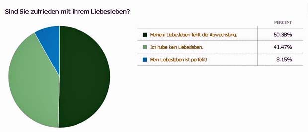 Nur acht Prozent der von der Causal-Dating-Agentur C-Date befragten Frauen und Männer waren mit ihrem Liebesleben wirklich zufrieden – doch das ist nicht die entscheidende Meldung, sondern eher diese: Etwa 41 Prozent der Befragten gaben an, gar kein Liebesleben zu haben – und das ist eher eine traurige Bilanz.