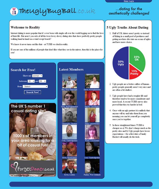 Ihr habt ja ewig nix mehr von mir gehört, Freunde – aber das liegt daran, das ich dauernd Pinot saufe und mit den Mädchen in Lianes Bar herumpoussiere. Heute aber vermelde ich pflichtschuldigst, dass bei den Inselbewohnern oben rechts aka im „Vereinigten Königreich“ eine Webseite entstanden ist, die sich an „ästhetisch benachteiligte Personen“ wendet, und die dazu dienen soll auch „unattraktiven Menschen“ die Möglichkeit zu geben, zu flirten und sich zu treffen, ohne wegen ihrer Hässlichkeit oder ihres Übergewichts ausgelacht zu werden“.