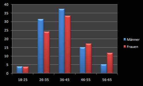 Dabei stellen wir immer wieder fest: Die ganz jungen Leute unter 25 sind kaum an „ganz festen Beziehungen“ über das Internet interessiert – und wenn, dann melden sich junge Frauen an, die von deutlich älteren Männern gefundene werden wollen. Deswegen besteht in diesem Bereich entweder Gleichheit oder ein leichter Frauenüberschuss. Bei den 26 – 35 jährigen finden wir seit Jahren ein Ungleichgewicht: In dieser Gruppe suchen wesentlich mehr Männer als Frauen. Diese Tendenz nivelliert sich dann bei den 36-45-jährigen Frauen und Männern. Hier herrscht annähernd Gleichstand, während bei den 46-55-Jährigen ein leichter Frauenüberschuss auftritt, der dann bei den 56-65-Jährigen rapide zunimmt.