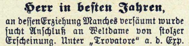 Da suchte sich der geneigte Herr schon einmal eine Dame, etwas Sinnreiches daran tun sollte, die an „ihm versäumte Erziehung“ nachzuholen. In der gleichen Gazette sucht ein Ehepaar „eine Freundin“ und ein anderes Paar ein „gleichaltriges Ehepaar oder einen Herrn“. Für die vernachlässigten Damen bietet sich ein „Tenor mit sieghaftem Organ“ an und für die Damen, die statt des Organs etwas Härte lieben, ist ein sehr „energischer Sportsmann“ zur Stelle.