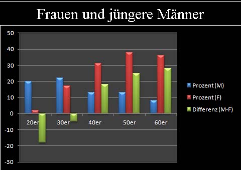 Wie denken nun die Männer darüber? Besonders die 20- bis 39-jährigen Männer wären bereit, eine wesentlich ältere Frau zu treffen (gegen 21 Prozent), währen der Wunsch der Männer danach mit zunehmendem Alter deutlich fällt.