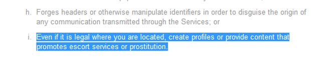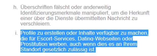 Dating-Webseiten, Escort-Services (vormals Callgirls) und Huren? Ich traue meinen Augen nicht, aber der „Standard“ in Österreich hatte es auch schon festgestellt und ebenso „Businessinsider“ – der hatte allerdings keinen Eintrag über „Online-Dating gefunden – aber genau so steht es nun einmal in den deutschen Nutzungsbedingungen. Schnell ein Blick in die US-Nutzungsbedigungen: Da fehlt der Hinweis auf Online-Dating.