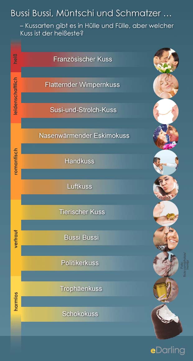 eDarling brachte eine Grafik zum Kusstag. Hervorstechende Merkmale sind die reichlich verquaste Übersetzung des „French Kiss“ als „Französischer Kuss“ (Zungenkuss). Mal ganz ehrlich – das einzige, was mich daran interessierte, war der Negerkuss – Pardon der Schokokuss. Was ein Susi-und-Strolch-Kuss ist, musste ich erst einmal nachsehen, aber er hat offenbar etwas mit Spaghetti zu tun.