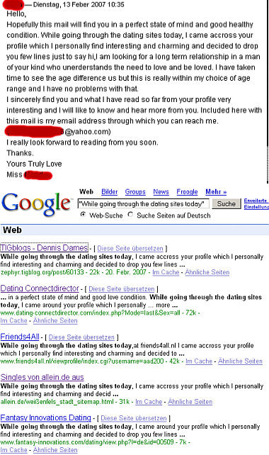Vor einigen Jahren bekamen Leute, die sich für Dating interessierten, immer noch Post von jungen Damen aus Deutschland – sie waren alle immer ähnlich, nur stand ein anderer Name darunter – und sie führten alle auf eine Webseite, auf der sich die Damen dann „schnuckelig“ zeigten – wer mehr wollte, musste einen Obulus entrichten.